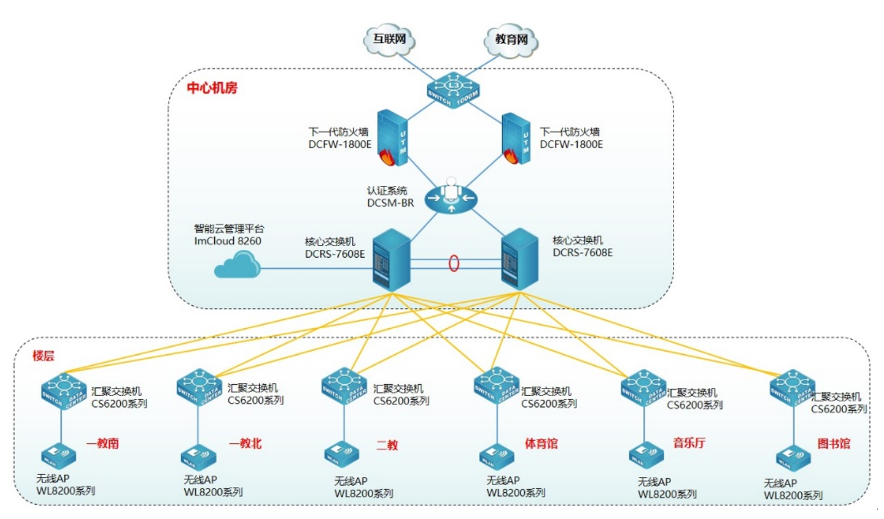 为方便用户对无线管理和维护,提升用户无线体验,使无线更智能化,此次采用奥林匹斯之门 pp电子奥林匹斯之门智能云管理平台ImCloud 8260实现无线统一的管理、维护、认证,并可实现对全网无线设备管理、实现易部署、易维护、易扩展的无线网络。奥林匹斯之门 pp电子奥林匹斯之门云管理ImCloud方案是网络服务的新模式,基于云端实现网络服务和管理,将复杂的网络管理简单化、智能化、可视化,提升用户网络体验。同时为了保证无线的安全,无线采用Portal准入认证,云管理ImCloud和奥林匹斯之门 pp电子奥林匹斯之门身份认证系统DCSM-BR实现联动,用户需要顺利获得账号和密码认证成功后才能接入无线网络,在保证无线连接的便捷性同时兼顾无线的安全性。