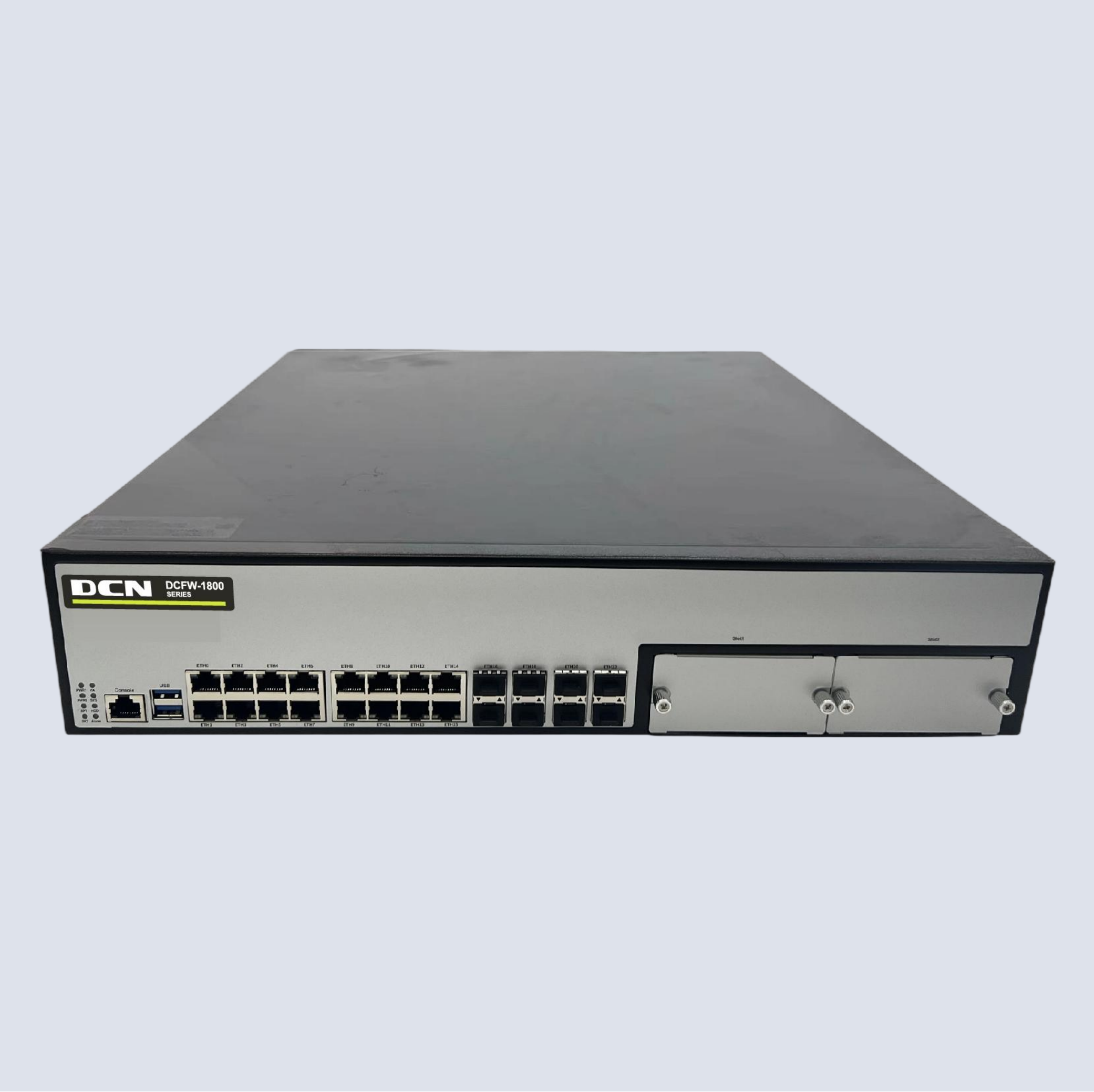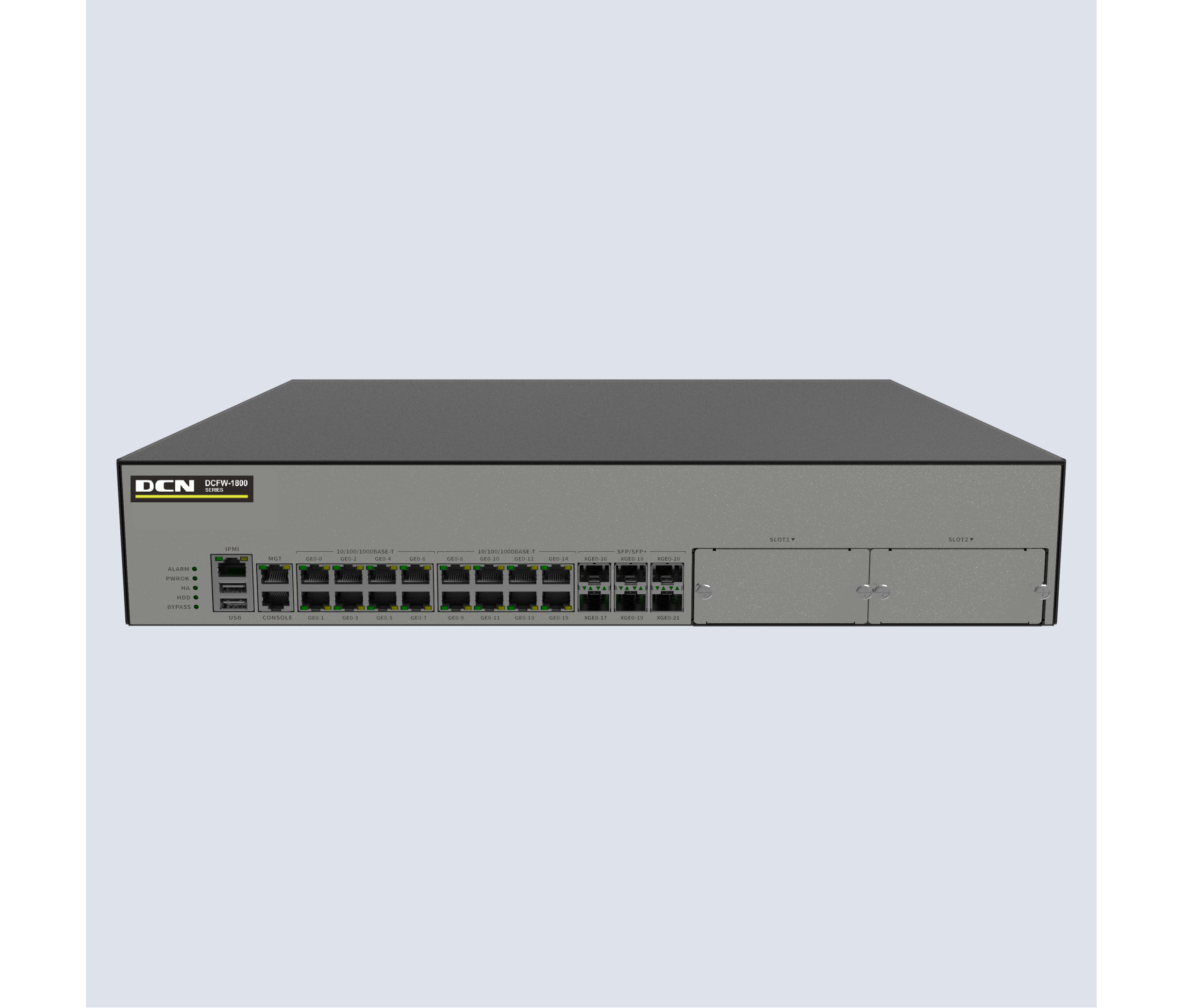 DCFW-1800-H4120 16个千兆电接口,4个千兆光接口,4个万光兆接口,2扩,2U高度,8G内存,19寸机箱,标配1T硬盘,2组bypass,标配双电源,1G带宽;